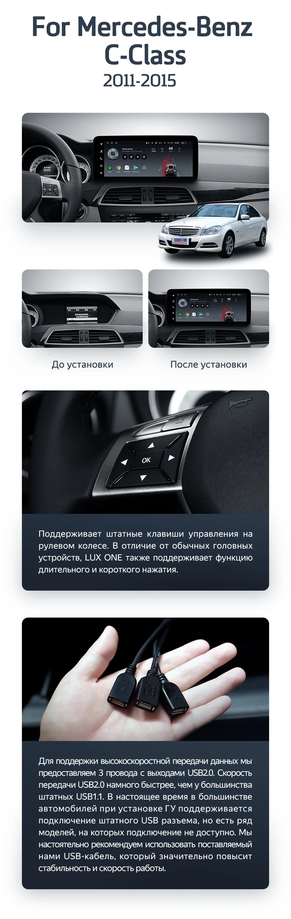 Готовый установочный комплект для магнитолы Mercedes-Benz C-Class W204 C204 S204 (NTG 4.0) (TY) (2011-2015) 12,3 дюйма в штатное место, включает переходную рамку и проводку.