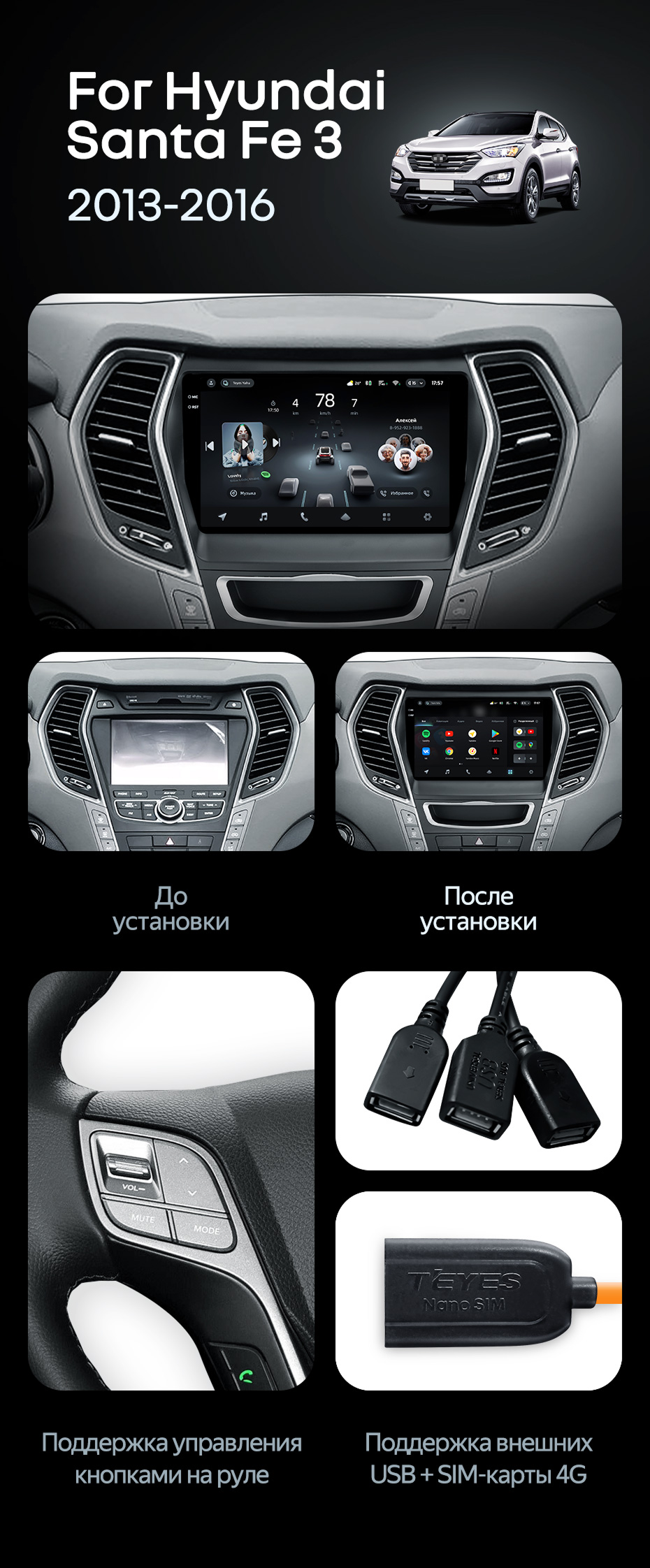 Штатная магнитола Teyes CC4 Pro 12/256 Hyundai Santa Fe 3 (2013-2016) Тип-B - купить всего за 69 500 руб. в интернет-магазине в Ставрополе Teyes.com.ru. ✓ Самый лучший выбор мультимедиа ✓ Лучшая замена штатному ГУ ✓ Тел. +7 (800) 775-31-74