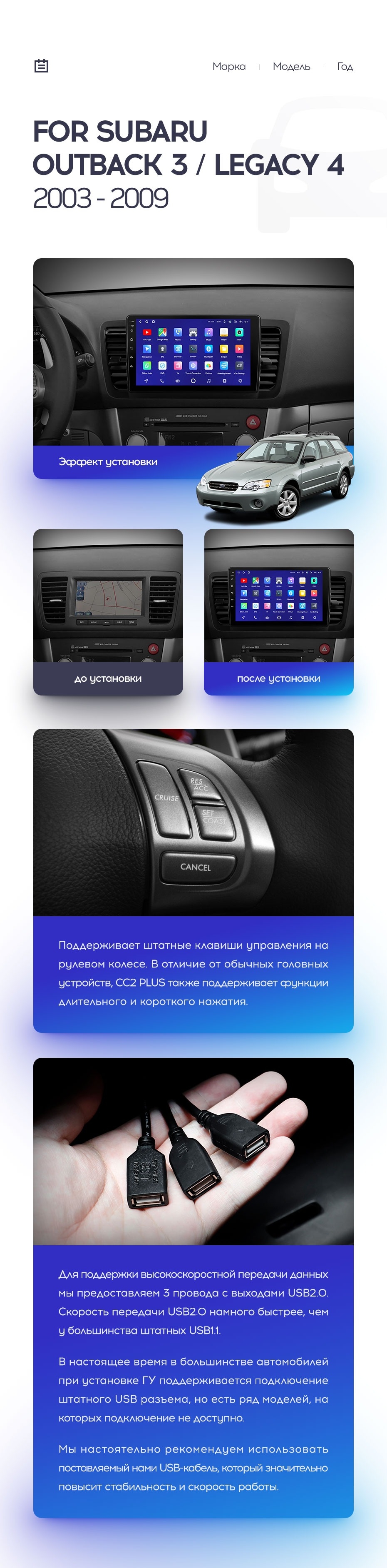 Полный комплект установки магнитолы Teyes с рамкой и проводкой можно выбрать в каталоге штатных магнитол Subaru Legacy 4 (2003-2009).